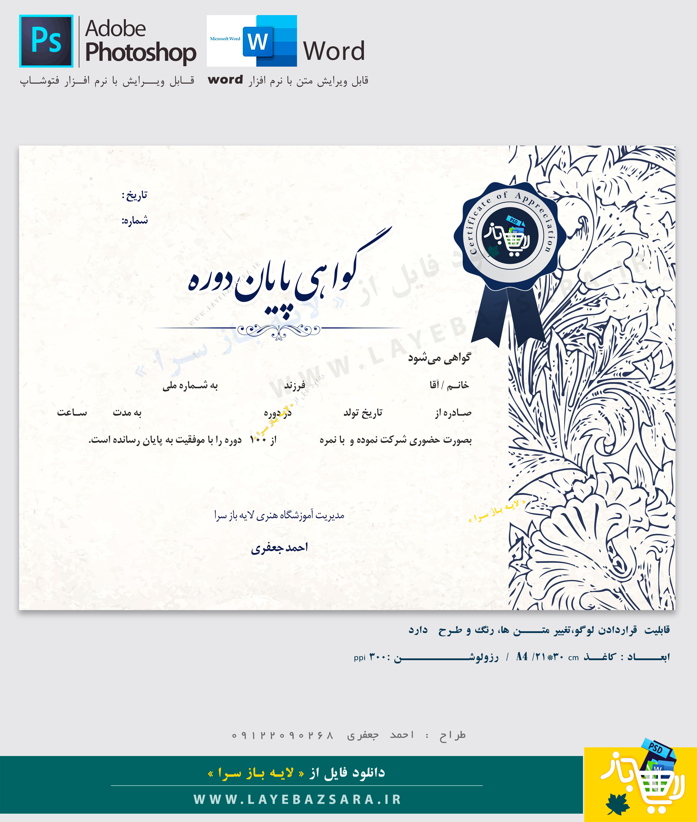 نمونه مدرک آموزشگاه گواهی پایان دوره آموزشگاه در قالب ورد word و فتوشاپ